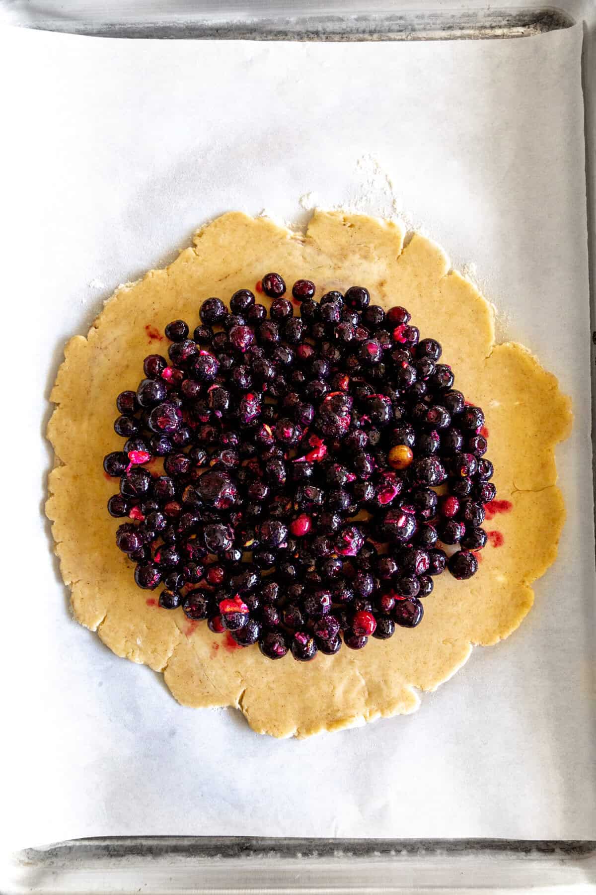Pour the blueberry filling over the dough, leaving a clean 1-2 inch border around the edge.